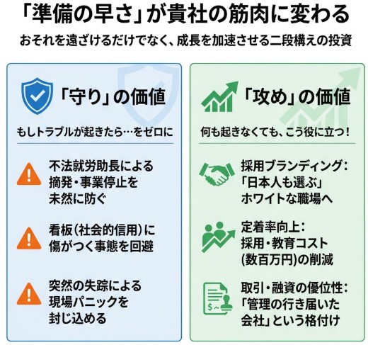 物流・観光業の現場を守る。内部点検のプロが実現する、揺るぎない外国人雇用管理。役務サービスは、現場の「人」がその瞬間に生み出す商品であり会社の顔です。検品ができないからこそ、スタッフ一人ひとりが迷いなく正しく動ける「自律した仕組み」こそが、取引先やお客様からの信頼を守る最強の経営基盤となります。
