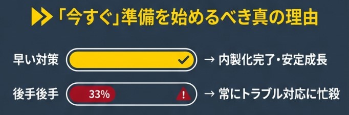 現場で実際に使える「行動指針」を共に創ります。専門家が介在し続けなくても、御社内の戦力だけで教育や監視が完結する状態を目指します。